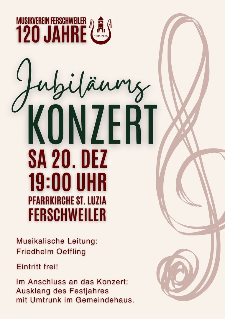 Der Musikverein „Lyra“ 1905 Ferschweiler lädt herzlich zum Jahreskonzert am Samstag, 20. Dezember 2025, um 19:00 Uhr in der Pfarrkirche St. Luzia ein.