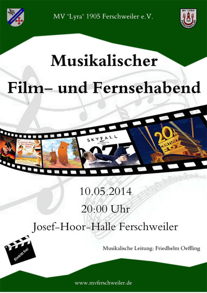 Anlässlichdes diesjährigen Frühlingskonzertes lädt der Musikverein "Lyra" 1905 Ferschweiler Sie auf eine Reise durch die Film- und Fernsehgeschichteein . Dabei stellt der Musikverein Filmmusik aus mehreren Jahrzehnten vor. Freuen Sie sich auf ein abwechslungsreiches Programm. Es erwartet Sie unter anderem die Musik aus "Vom Winde verweht", "Skyfall", "Bärenbrüder" und vielen anderen Filmen.